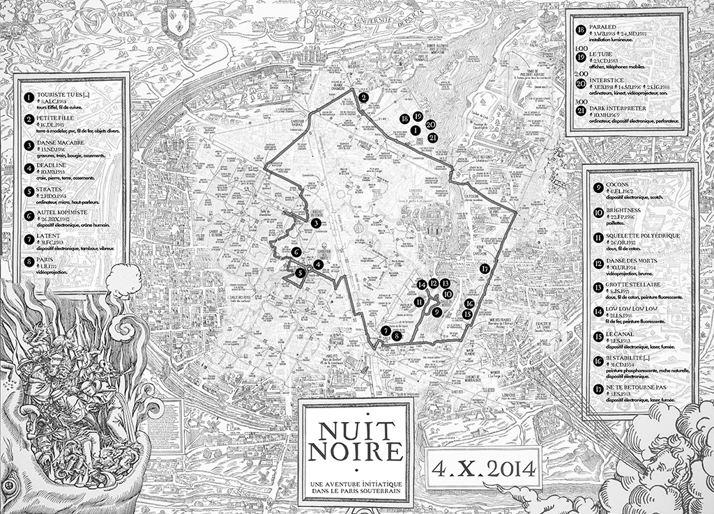 Nuit Noire est une expérience in situ, un parcours artistique à travers la ville, ses souterrains et leur histoire. Trois années de suite, artistes et passionnés ont élaboré une composition visuelle et sonore, se jouant des conditionnements et attentes de ses spectateurs.
