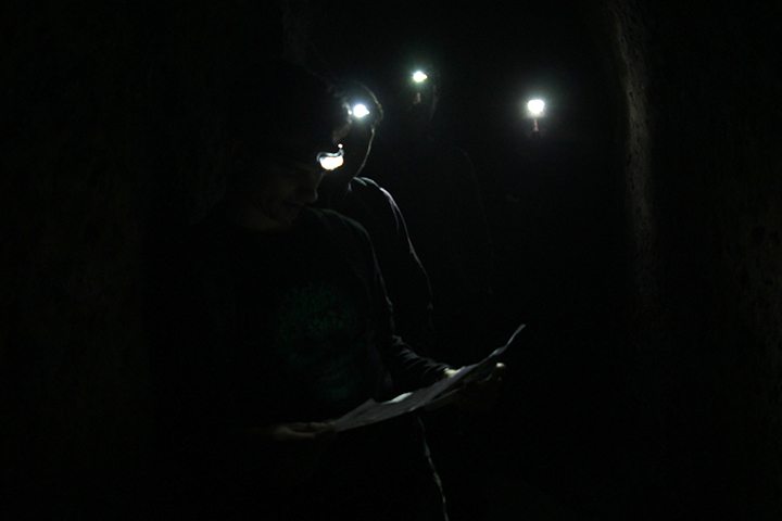 Le chemin commence dans un champ de ruines. Au détour des murs surgissent les ombres de travailleurs oubliés et des témoignages photographiques de vestiges de la société du spectacle. Se diriger alors vers les lueurs de lointaines bougies ne résultera qu'à errer en vain. En apprenant à se repérer, cataphiles et touristes s'enfoncent dans les bermudes.
