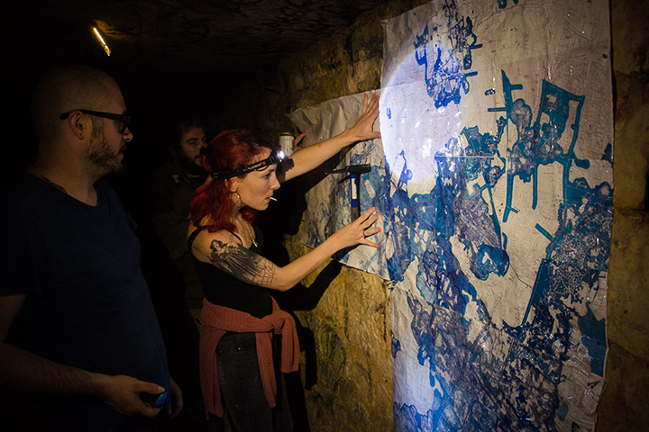 S'en suit une quête aux œuvres glissées dans la ville. Voix de philosophes, lectures de « voyage au centre de la terre », bruits d'eau captés et réenregistrés en souterrain, s'échappent de soupiraux, de trappes et de bouches d'évacuations. Un cairn mène vers l'escalier, où des livres remontés de la bibliothèque libre des catacombes révèlent des messages subliminaux.