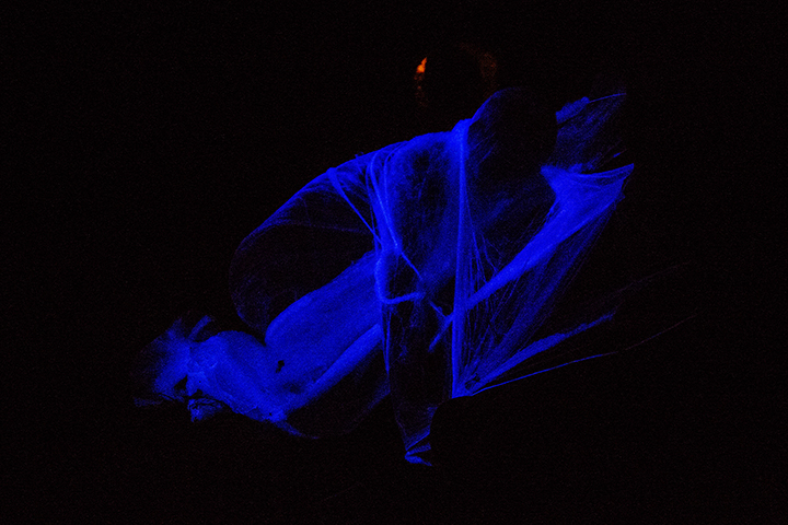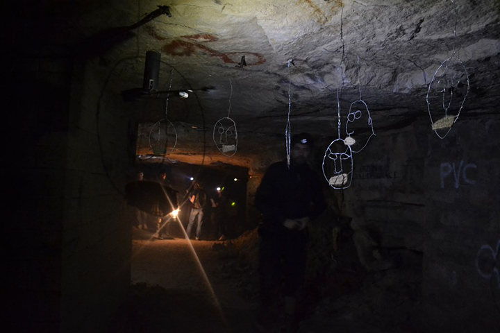 3.2 Les tunnels L'apparition d'un puits paré de paillettes sonne le début d'une série de performances. Des bruits retentissent. Un homme en bleu de travail traverse le tunnel en tirant une plaque de fer rouillé dont la friction avec les rails émet des sonorités stridentes reprises par l'écho de la voûte. Un spot de lumière noire s'active. Un cocon se révèle. Un être nu est enchevêtré dans une toile d'araignée qu'il va progressivement étendre sur le public silencieux. Une échelle de fortune glisse lentement le long de la paroi, composée de vêtements unis par une couturière à l’œuvre en surplomb. Le second volet de la programmation radiophonique reprend, les catacombes sont dévoilées par les témoignages de passionnés interviewés en direct depuis un studio souterrain.