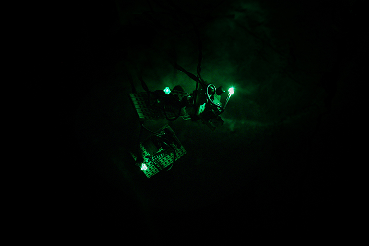 La suite est jalonnée par des propositions tant géométriques que lumineuses, points de fuites vers la salle électrogène. Les vibrations d'un live électronique expérimental clôturent la nuit.
