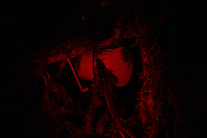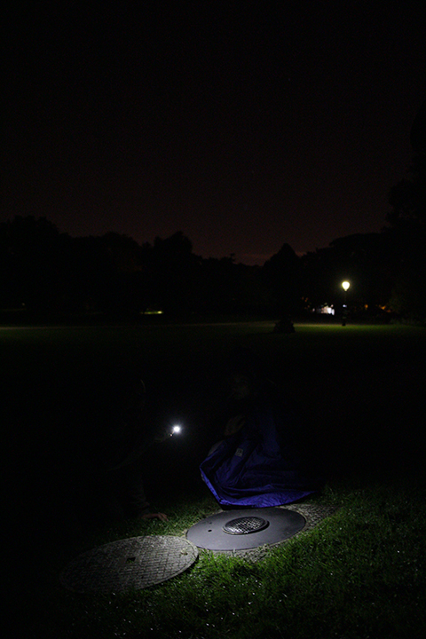 3.3 Le parcAprès ces récits d'initiés, rendez vous au pied du Montsouris. Le chemin est ponctué de lueurs, d'ultrasons, de bruits mécaniques et de crépitements électroniques. Un rythme industriel émane de la butte. Les arbres dissimulent des hauts-parleurs de gare. Une plaque de l'Inspection Générale des Carrières transformée en caisson de basses accueille un live à l'atmosphère chamanique. Il est cinq heures, Paris s'éveille, le jour se lève sur un mix de rap français aux allures de manifeste.