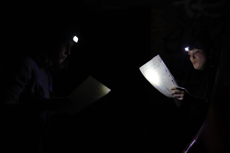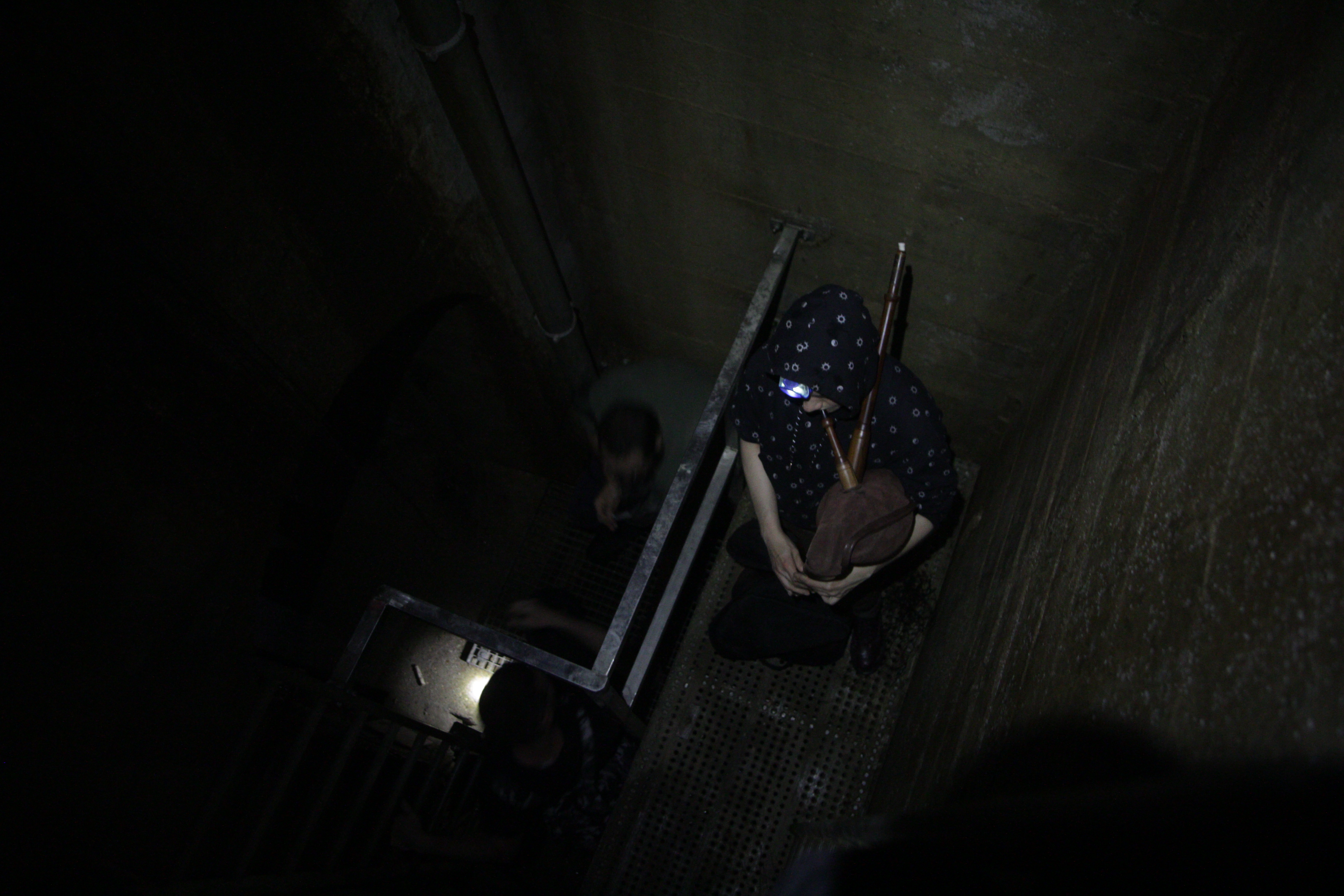 Un duo de voix qui résonnent dans l'obscurité de l'escalier à double hélice d'un ancien abri antiatomique. ++