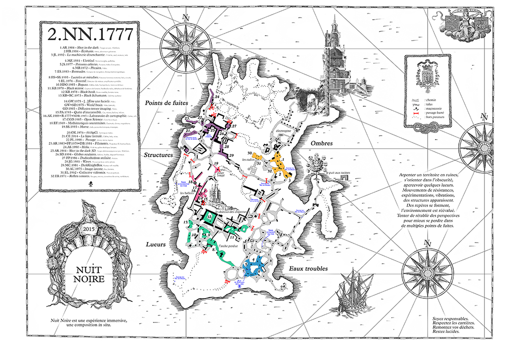 Nuit Noire est une expérience in situ, un parcours artistique à travers la ville, ses souterrains et leur histoire. Trois années de suite, artistes et passionnés ont élaboré une composition visuelle et sonore, se jouant des conditionnements et attentes de ses spectateurs.