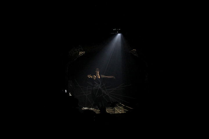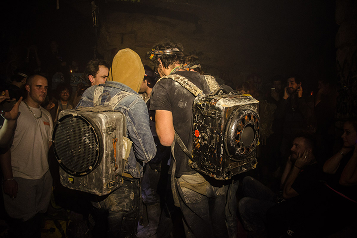 3.2 Les tunnels L'apparition d'un puits paré de paillettes sonne le début d'une série de performances. Des bruits retentissent. Un homme en bleu de travail traverse le tunnel en tirant une plaque de fer rouillé dont la friction avec les rails émet des sonorités stridentes reprises par l'écho de la voûte. Un spot de lumière noire s'active. Un cocon se révèle. Un être nu est enchevêtré dans une toile d'araignée qu'il va progressivement étendre sur le public silencieux. Une échelle de fortune glisse lentement le long de la paroi, composée de vêtements unis par une couturière à l’œuvre en surplomb. Le second volet de la programmation radiophonique reprend, les catacombes sont dévoilées par les témoignages de passionnés interviewés en direct depuis un studio souterrain.
