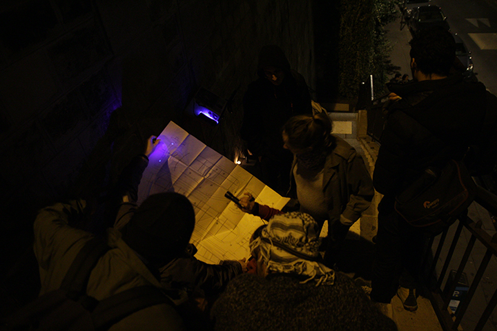 Dans les rues, des coursiers font la ronde et diffusent la première partie de la programmation radiophonique de paysages sonores captés dans les souterrains. Plus loin, une antenne radio s'échappe d'une plaque, le bateau pirate d'un jardin d'enfants prête sa table d'échec. Les joueurs s'affrontent avec un jeu uniformément noir composé des pièces dessinées par Marcel Duchamp. S'entame alors une longue marche jusqu'aux voies de la Petite Ceinture et ses tunnels.
