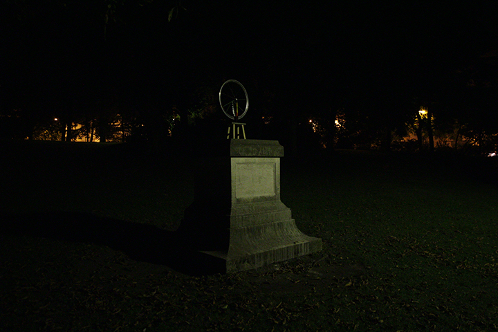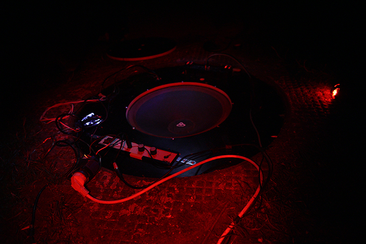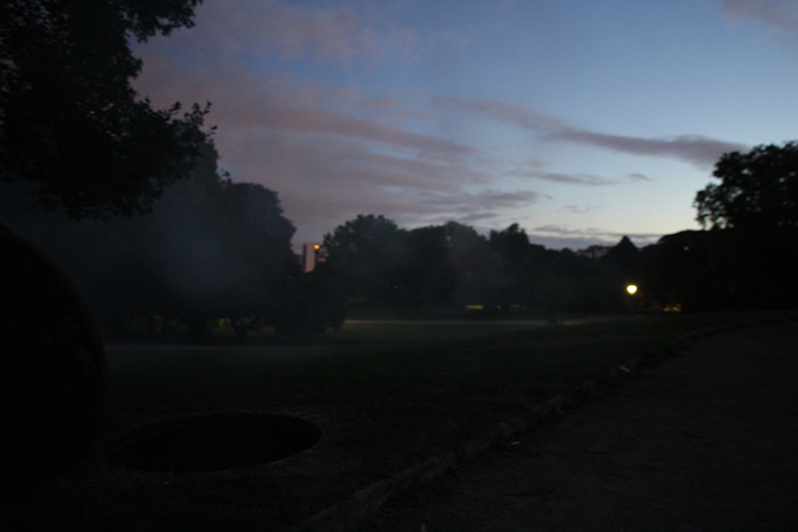 3.3 Le parcAprès ces récits d'initiés, rendez vous au pied du Montsouris. Le chemin est ponctué de lueurs, d'ultrasons, de bruits mécaniques et de crépitements électroniques. Un rythme industriel émane de la butte. Les arbres dissimulent des hauts-parleurs de gare. Une plaque de l'Inspection Générale des Carrières transformée en caisson de basses accueille un live à l'atmosphère chamanique. Il est cinq heures, Paris s'éveille, le jour se lève sur un mix de rap français aux allures de manifeste.